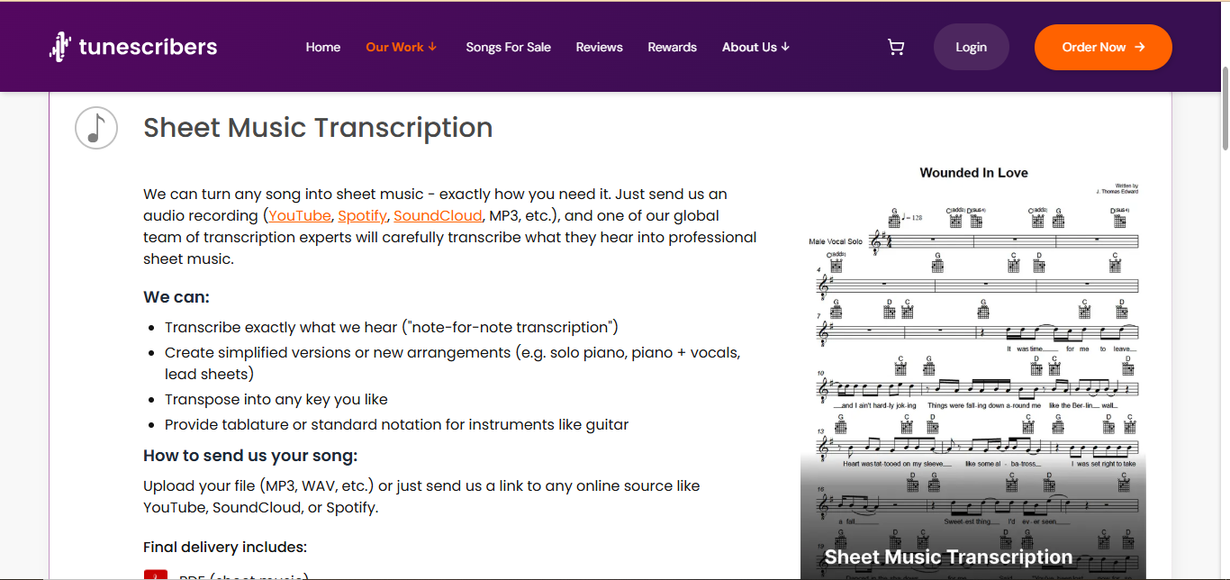 - Main Purpose: Tunescribers is an online music transcription and arrangement service. It transforms any audio source—such as YouTube, Spotify, or MP3—into professional sheet music, backing tracks, piano performance videos, karaoke tracks, and more .