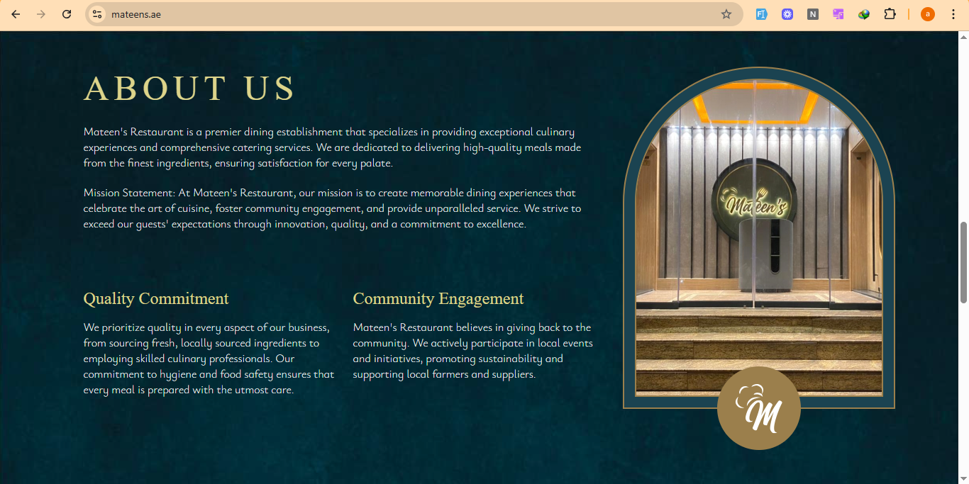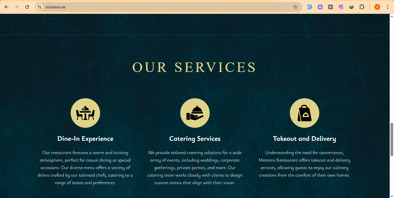 - Relationship Management: Engages customers via service offerings (dine-in, catering, delivery), menu previews, contact or inquiry options, and presumably reservations or order placements. The site is designed to build trust through quality assurance, about-us details, and community engagement.